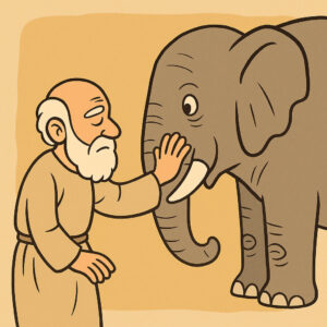 A primera vista, la ilustración parece acertada… pero tiene un defecto fatal. El problema radica en que cada sabio solo accede a una parte del elefante, sin conocer el conjunto. Para que esta historia sirviera de apoyo como analogía de las religiones, cada “ciego” tendría que tener una visión global del elefante, o al menos alguien tendría que ver el cuadro completo. Pero en ese caso, el relato se derrumba por dos razones, primera, porque estaríamos admitiendo que sí existe una verdad completa —y que alguien puede conocerla. Segunda, porque el ciego basa su descripción solo en el tacto, lo cual limita su percepción de lo que tiene que descubrir.
